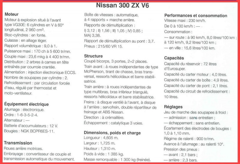 La voiture était très bien équipée pour le marché français : climatisation, direction assistée, vitres électriques, fermeture centralisée, régulateur de vitesse, rétroviseurs électriques, ABS, intérieur cuir ainsi que le fameux T-Top, dit « Toit targa » qui avait créé un fort engouement sur la gamme Fairlady Z à partir de la 280ZX aux États-Unis.